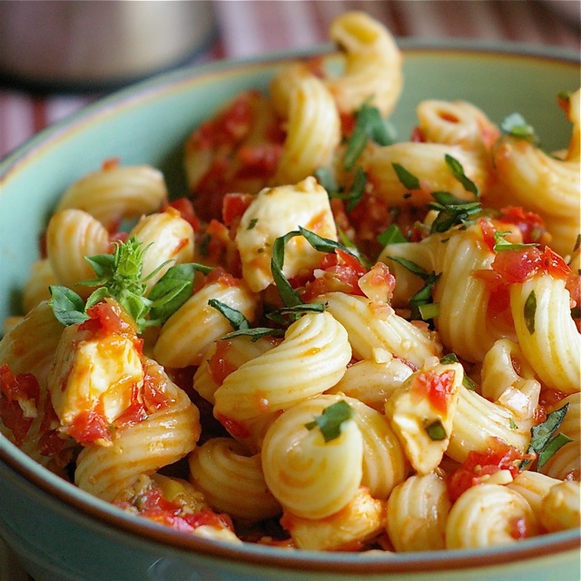Meanwhile, bring a pot of salted water to a boil and cook your pasta according to the package directions. Drain the pasta (reserve about 1/4 cup of the pasta cooking water in case the sauce seems dry) and immediately throw the hot pasta into the bowl with the sauce and toss to coat evenly. The mozzarella will start to get all soft and gooey.